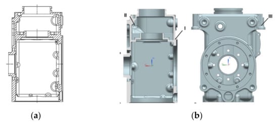 The desired 3D model of the lower angular gearbox housing was originally designed for manufacturing using foundry technology. The SSS of the original hull structure was calculated in order to determine the zones, which are clearly have “extra” material to be removed. These small areas of interest can be modified without significantly affecting the adjacent bigger partitions of the housing. The general view of the model and the modification areas are given in Figure 1a,b respectively. In the Figure 1b there are several areas: (1) a massive connection with a variable thickness, converted into an element of a constant thickness of ~30% from the maximal value; (2) the thickness of the tidal wall is reduced by ~18%; and (3) well for bolts placement with the reduced value of the walls by ~50%. Modification of the gearbox housing was performed by the finite element method (FEM) using the ANSYS software package [16]. The mass of the aluminum gearbox housing was successfully reduced rather than the weight of the original part by 15% while meeting the strength requirements (Table 1). Materials’ characteristics powder Aluminum AlSi10Mg are next [17]: tensile strength = 430 MPa), yield point = 245 MPa, elongation = 9%. The minimum factor of the safety of the modified structure is more 5. It is enough for the specified operating conditions.