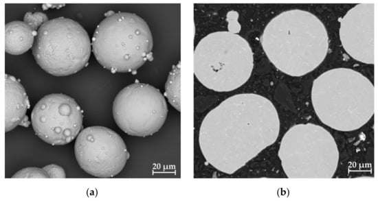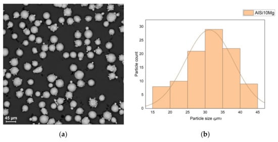 The batch of powder used for 3D printing was subjected to the granulometric analysis and the basic metallographic analysis. The particle size was measured from electron backscattering (BSE) images on base the ImageJ software. The average values were calculated based on the results of 100 measurements collected from a 350 × 350 µm area. Figure 2a shows a panoramic BSE image of AlSi10Mg particles and Figure 2b shows the diagram of particle size distribution.