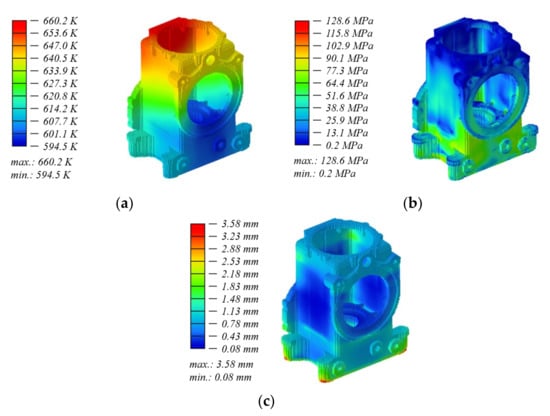 Figure 6 shows the distribution and values of the temperature field (a), the stress field (b) by Mises and displacements (c) in a virtual grown volume. These images correspond to the final stage of the 3D printing simulation of the gearbox housing, when 100% of the volume of layer-by-layer calculations were performed. The maximal stresses and displacement allocated in the bottom part of the housing. The displacement of ~3.6 mm can damage the first layers an d accumulate the rest stresses from the bottom upwards. Nevertheless, according to the von Mieses stresses its value does not overcome ~128 MPa in most of the points, which is a rather low value for the critical construction damage. In the most places, the displacement does not go over the 1 mm threshold. Therefore, the obtained result has a good chance to grow the housing with the little percentage of warpage. And during the real printing, described in Section 6.2, more rigid support structures, like a fence, was used instead of the simple shell structures. That helps to reduce the displacements by more than 80%.