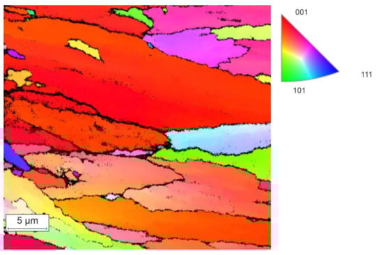 Figure 9 represents the EBSD data of the AlSi10Mg sample. Related to the results of the EBSD analysis the columnar grains are predominantly oriented in the 001 direction. The grain size is 5–25 μm. Grain orientation is directly related to the mechanical properties of the material. Direction 001 is preferred for obtaining enhanced plastic properties. In the sample there are also joints of grains with different orientation (example on Figure 9), which according to studies [24,25] promotes a high tendency to the nucleation of cracks. However, in the case of this sample, the effect of grain disorientation on crack formation is excluded.