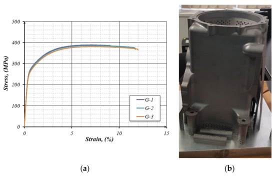 The strain-stress curves of three synthesized samples from the AlSi10Mg alloy (a); prototype of a GTE gearbox housing, made from AlSi10Mg alloy powder (b).