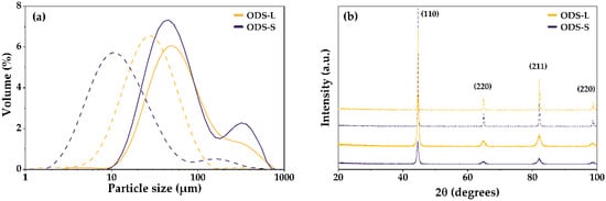 (a) Particle size distributions and (b) XRD patterns showing the evolution of the ODS-L and ODS-S steel powders with milling. The dashed lines correspond to the pre-alloyed powders, and the solid lines correspond to the mechanically alloyed powders.
