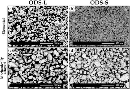 BSE SEM images of the ODS steel powders before and after milling: (a) ODS-L pre-alloyed powders, (b) ODS-S pre-alloyed powders, (c) ODS-L mechanically alloyed powders, and (d) ODS-S mechanically alloyed powders.
