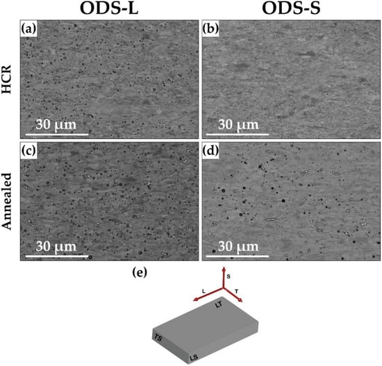 BSE SEM images with low magnification showing the microstructure of the ODS steels on the TS plane after HCR and after annealing at 1273 K. (a) ODS-L and (b) ODS-S steels after HCR; (c) ODS-L and (d) ODS-S steels and after annealing at 1273 K; (e) plane orientation scheme.