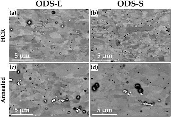 BSE SEM images with high magnification showing the general microstructure of the ODS steels on the TS plane after HCR and after annealing at 1273 K. (a) ODS-L and (b) ODS-S steels after HCR; (c) ODS-L and (d) ODS-S steels and after annealing at 1273 K.