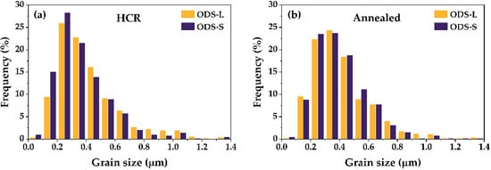 Grain size distribution measured from SEM images on the TS plane for the ODS-L and ODS-S steels: (a) after HCR; (b) after annealing at 1273 K.