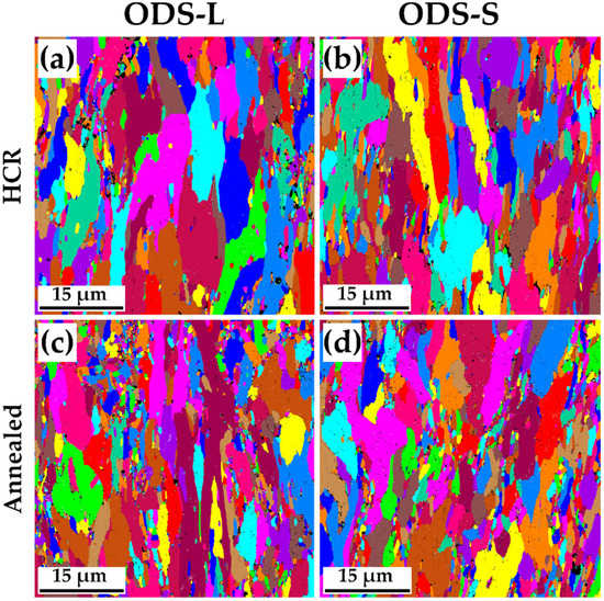 EBSD results highlight the distinctive features for anisotropic and high dislocation dense materials, characterizing texture and crystalline orientation. Unique Grain Color (UGC) maps allow to make a clear identification and quantification of grains among LAGB and HAGB. As observed from SEM results, the microstructural modifications caused by the HCR process led to a distribution of elongated micrometric grains and elongated or equiaxial submicrometric grains for both ODS-L and ODS-S steels (Figure 6). After annealing, the general microstructure remained highly stable for both samples. In general, for both samples, UGC maps do not emphasize new significant differences than the ones previously seen on SEM images (Figure 5), as it is described in Figure 7 and summarized in Table 2. For a comprehensive analysis, grain characterization is subdivided among grain diameters smaller or larger than 2 µm.