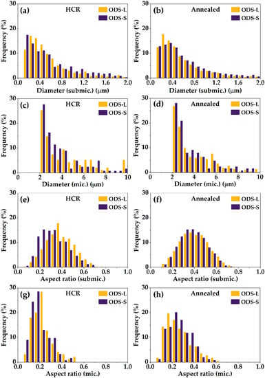 (a–d) Grain size distributions and (e–h) aspect ratios measured from UGC maps on submicrometric (<2 µm) and micrometric (>2 µm) sized grains for the ODS-L and ODS-S steels after HCR (a,c,e,g) and after annealing at 1273 K (b,d,f,h).