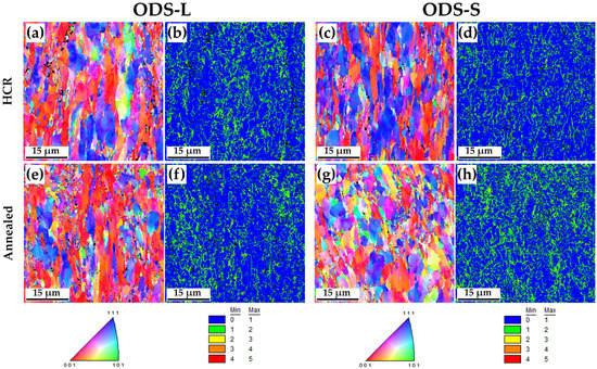 IPF and KAM maps taken on the TS plane for the ODS steels after HCR and after annealing at 1273 K. IPF maps: (a) ODS-L after HCR, (c) ODS-S after HCR, (e) ODS-L after annealing, and (g) ODS-S after annealing. The respective KAM maps are depicted on (b,d,f,h).
