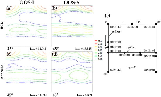ODF maps obtained on the TS plane after HCR and after annealing at 1273 K. (a) ODS-L and (b) ODS-S steels after HCR; (c) ODS-L and (d) ODS-S steels after annealing; (e) Euler space section φ2 = 45° and main fibers of laminate bcc materials.