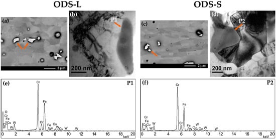 Micrographs and XEDS spectra showing Cr-W-rich precipitates on ODS-L and ODS-S steels after HCR and annealing at 1273 K: (a,c) BSE SEM micrographs, (b,d) BF-TEM micrographs, and (e,f) TEM-XEDS analyses.