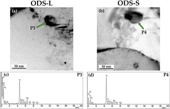 BF-TEM micrographs and corresponding XEDS spectra showing Ti-rich precipitates (marked with arrows) on ODS-L (a,c) and ODS-S (b,d) steels annealed at 1273 K after HCR.