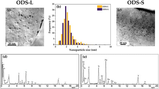 Y-Ti-O nanoparticles on ODS-L and ODS-S steel samples annealed at 1273 K after HCR: (a,c) BF-TEM micrographs, (b) particle size histogram, and (d,e) TEM-XEDS analysis.