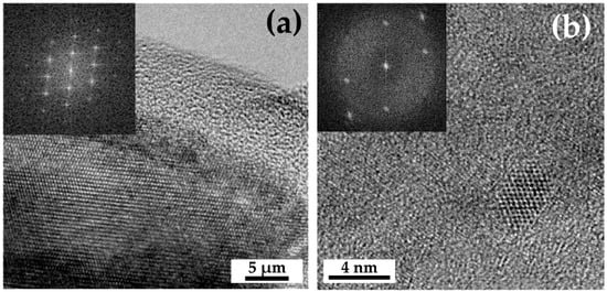 Y-Ti-O nanoparticles were analyzed on both samples after the annealing treatment, revealing comparable results. TEM images on BF mode (Figure 12a,b) show a high amount of nanoparticles with sizes < 30 nm. Their mean size in both steels was 3 ± 4 nm, with 95% of them smaller than 5 nm. Generally, the Y-Ti-O nanodispersoids exhibited round or rectangular morphologies, and they appear homogenously distributed in the interior of grains. Particle number density measurements ranged between (0.9–5.4) × 1023 m−3 and (0.71–7) × 1023 m−3, respectively, for the ODS-L and ODS-S steels [25,26]. Several nanoparticles were indexed from HREM micrographs (Figure 13b), and most of them could be identified as Y2TiO5 (none of them were identified as Y2O3).