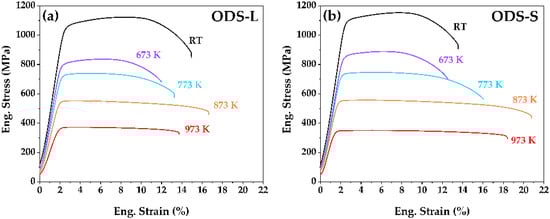 Representative stress-strain curves obtained from tensile test experiments performed on ODS steel samples annealed at 1273 K after HCR along the TS plane: (a) ODS-L; (b) ODS-S. Test temperatures ranged between RT and 973 K.