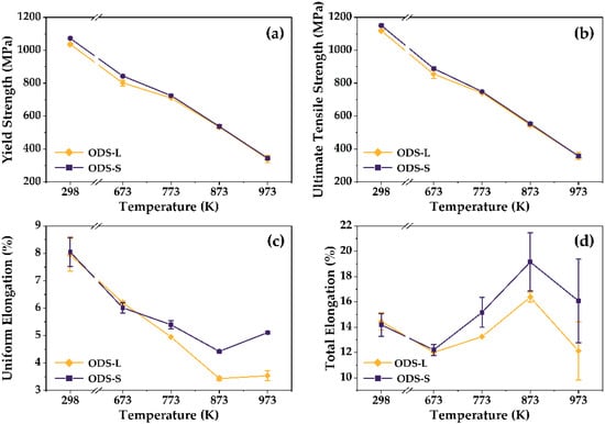 Selected stress-strain curves, measured from tensile tests performed between room temperature (RT = 298 K) and 973 K, are summarized in Figure 14. Mechanical properties obtained from this analysis are depicted in Figure 15. Yield and ultimate tensile strengths (YS and UTS) have a similar behavior for both samples over the investigated test temperature range, decreasing continuously with temperature to 340 ± 20 and 360 ± 20 MPa for the ODS-L steel and 345 ± 6 and 358 ± 9 MPa for the ODS-S steel at 973 K.