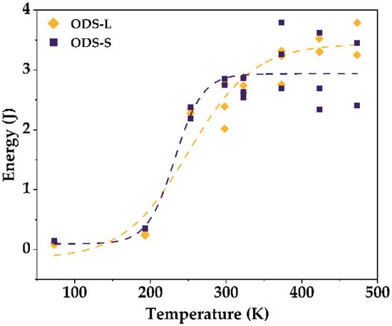 The LSE value for the ODS-S steel is 52% higher than the one for the ODS-L steel. In addition, from the absorbed energy curves, the LSE is ~10% of USE for the ODS-S steel and ~6% of USE for the ODS-L one, indicating a higher toughness of the ODS-S steel at ~100 K. The DBTT values obtained for both alloys are in the best value range reported for ODS steels [11,20,26]: 250 ± 12 K for the ODS-L steel and 230 ± 20 K for the ODS-S one (7% lower than ODS-L). This result suggests that starting with finer powder particles may have a positive effect on the DBTT of these ODS steels. However, although the transition regime at the DBTT is sharper for the ODS-S steel, its USE is slightly lower, and it presents a larger dispersion than the result obtained for the ODS-L steel. In any case, the maximum USE values measured are similar in both samples.