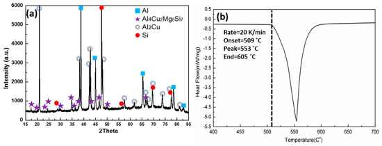 (a) XRD spectrum of Al−Cu−Si−Mg eutectic alloy (b) DSC curve of Al−Cu−Si−Mg eutectic alloy with a heating rate of 20 K/min.