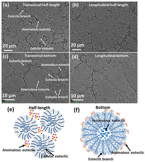 Figure 3a,b shows the microstructures of the quaternary Al-Cu-Si-Mg alloy, taken from transverse and longitudinal sections at the half-length position in the sample, respectively. The microstructures of the transverse and longitudinal sections are quite similar, indicating a 3D equiaxed cellular structure, consisting of coupled eutectic cells, 5–25 μm in size, and anomalous eutectic in the intercellular regions. The microstructures of the alloy obtained from the transverse and longitudinal section at the bottom of the sample are shown in Figure 3c,d, respectively. The microstructures of the transverse and longitudinal sections are again quite similar, again indicating a 3D equiaxed cellular structure, consisting of coupled eutectic cells, 10–25 μm in size, and anomalous eutectic in the intercellular regions. The main differences between the microstructures at the half-length in Figure 3a,b and at the bottom in Figure 3c,d are that (1) the spacing of the eutectic phases is much smaller at the bottom, indicating a faster cooling rate and solidification speed, and (2) the size of the eutectic cells is a little larger at the bottom. Schematics of the microstructures at the half-length and the bottom are shown in Figure 3e,f, respectively.