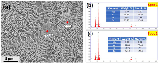 Figure 4a shows the microstructure at higher magnification, showing both the coupled cellular eutectic structure and the intercellular regions, taken from a transverse section of the half-length sample. The coupled eutectic cells and the anomalous eutectic in the intercellular regions can be seen more clearly. The interlamellar spacing of the Al2Cu and α-Al phases at the cell boundaries is 500–800 nm, and at the cell centre is 150–250 nm. SEM EDX point analyses of Spot 1 and Spot 2 taken from Figure 4a are displayed in Figure 4b,c. All four elements were present in both the cell centres and the intercellular regions, but there was considerably more Si and Mg in the anomalous eutectic intercellular regions.