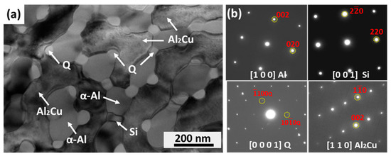 TEM bright-field image of (a) the microstructure taken from the cell centre and (b) corresponding SADPs of Al, Si, Q and Al2Cu phases.