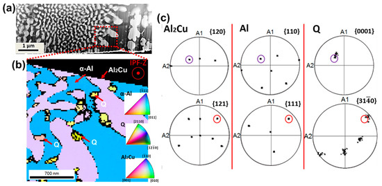 An IPF-Z map taken from the cell boundary from the half-length of the sample is shown in Figure 8b, which was taken from the same sample prepared by FIB (Figure 7a). The size of the Q phase particles increased to ~200 nm in the cell boundary. The lamellar α-Al and Al2Cu structure appeared irregular compared with the cell centre. Pole figures of the Al2Cu, α-Al and Q phases in the cell boundary are shown in Figure 8b. The common planes of the α-Al and Al2Cu phases were found to be the same as those in the cell centre without misorientation. However, the Q phase has a large deviation from {0001} and {310} planes, indicating that the Q particles at the cell boundary exhibit different orientations. In other words, there were no well-defined orientation relationships between Q and Al2Cu, or Q and α-Al phases in the cell boundaries.