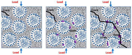 It is reported that structural heterogeneities such as exist in bimodal or multi-modal eutectics are an effective approach to dissipating excessive stress via the rotation of cellular colonies [54,55]. Although the quaternary eutectic has a bimodal eutectic structure, no rotation behaviour was observed from the fracture surface. It can be also induced by the relatively lower compressive plasticity compared with Al-Cu-Si based ultrafine eutectic alloys [26]. Instead, many wavy microcracks similar to eutectic cell sizes were found at the eutectic cell boundaries, which had very coarse Al2Cu lamellae. In another word, the crack initiates from coarse Al2Cu lamellae. The crack tends to extend along the cell boundaries, rather than penetrate into the eutectic cells. The suggested fracture mechanism of bimodal quaternary Al-Cu-Si-Mg alloy is shown in Figure 12. Firstly, the nucleation of the crack occurs in the defects or large voids near the surface of the sample. Secondly, the increase in load leads to the extension of the crack along the cell boundaries, meanwhile, some voids nucleate and grow because the stress near the eutectic cells exceeds the critical value of the coarse Al2Cu lamellae. Finally, the main crack further propagates along the cell boundaries and some small cracks penetrate into the eutectic cells with the increase of stress inside the cells. As a result, catastrophic failure takes place.