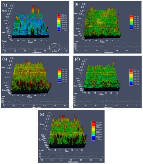 The 3D morphology of MAO coatings. (a) S0; (b) S1; (c) S2; (d) S3; (e) S4.