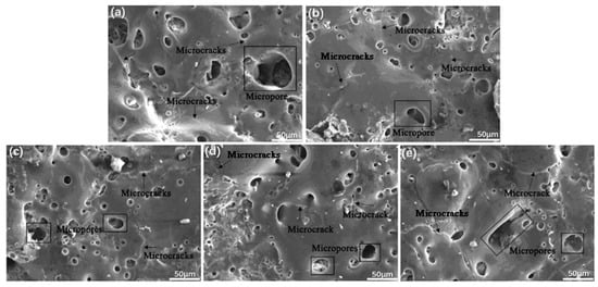 Surface morphology of MAO coatings (a) S0; (b) S1; (c) S2; (d) S3; (e) S4.