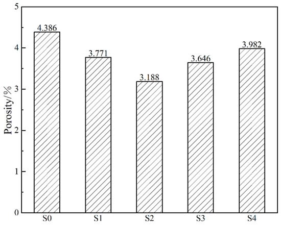 The porosity of different coating surfaces is shown in Figure 4. The porosity is 4.386% for a coating prepared by an electrolyte without graphene. The porosity of S2 is the minimum at 3.188% with 0.10 g/L graphene in the electrolyte. The decrease in porosity contributes to the improvement of the corrosion resistance of the coating. The compact coating is mainly due to the following two reasons: Firstly, the addition of graphene leads to a smaller diameter of pores and fewer cracks in the coating during the MAO process. Secondly, the graphene as an additive is moved to the substrate surface, and deposited into the coating in the form of physical encapsulation.
