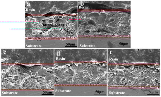 Cross-section morphology of MAO coatings (a) S0; (b) S1; (c) S2; (d) S3; (e) S4.