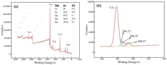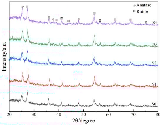 XRD patterns of the MAO coatings with different graphene additions in the electrolyte are shown in Figure 6. It is evident from the figure that the coatings were mainly composed of rutile TiO2 and anatase TiO2. Notably, the chemical compounds associated with the graphene in the electrolyte and titanium were not detected in the coatings, which meant that the coatings were compact. The XPS results of MAO coating on S4 were shown in Figure 7. With graphene (0.2 g/L) in the electrolyte, a peak of carbon was detected, indicating that the C entered the coating. The peak binding energies of C1s are 284.72 eV, 286.79 eV, and 288.47 eV, respectively, corresponding to C-C, C-O-H, and O-C=O chemical bonds. This means that the C appeared as these chemical bonds in the MAO coating. This is due to the graphene’s oxidation or reaction with the electrolyte during the micro-arc oxidation process. Rutile TiO2 and anatase TiO2 phases are different crystal types of TiO2. Rutile TiO2 is a relatively stable crystal type, while anatase TiO2 can be transformed into a more stable rutile TiO2 under certain conditions. After the addition of graphene in the electrolyte, there was a slight change in the XRD patterns, as shown in the S1 pattern. The diffraction peak of rutile TiO2 is stronger than others.
