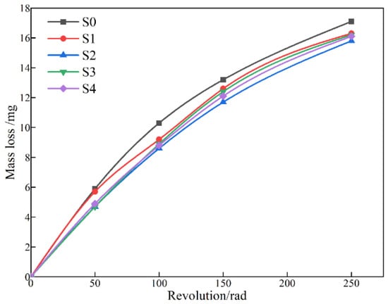 Figure 9 shows the wear loss of the coating. The wear was the most serious on the first 100 revolutions and decreased during the 100th–250th revolutions. At the early stage of wearing, the friction pair was in contact with each other under the action of loading. There are two reasons for the increase in wear loss. Firstly, the outer layer of the coating is relatively loose. Secondly, the end of micro-arc discharge only occurs on the local surface of the coating, and high micro convex particles are formed. This caused the coating to fall off easier after contact with the sandpaper, and the wear loss was large. After 100 revolutions of wearing, the loose layer and higher micro-convex body had fallen off and the contact area between the friction pair increased, so the mass loss decreased gradually. By comparing the mass loss before and after adding graphene, it can be found that graphene reduced the mass loss of the coating during the wearing process. The wear resistance of the coating obtained by adding 0.10 g/L graphene is the highest, and the mass loss with 250 revolutions was only 15.8 mg. There are two main reasons for the improvement of the wear resistance of the coating by graphene. First of all, the coating prepared with graphene in the electrolyte has higher compactness and wear resistance. Secondly, graphene enters into the coating during the MAO process, which can also play a certain role in lubrication [14]. In addition, there are holes formed by micro-arc discharge on the surface of the coating, which is beneficial to the storage of a lubricating medium in practical applications and can further reduce the wear caused by friction.