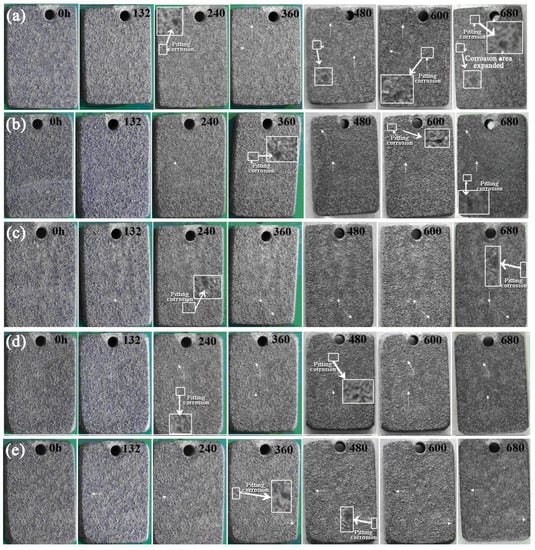 Figure 10 shows the corrosion morphology of the salt spray corrosion coating for different durations. From the morphologies, the MAO coatings have excellent corrosion resistance in a salt spray corrosion environment. After 132 h, some black pitting corrosion appeared on the surface of the coating, especially appearing on the micro holes of arc discharge or the edges of the specimens. With the prolongation of corrosion time, as shown in Figure 10a, comparing the pitting corrosion at the same position of the coating on S0 after 480 h corrosion and 680 h corrosion, the diameter of small black spots gradually expanded. By comparison to the coating on S0, both the number and area of the pitting corrosion on the coating surfaces of S1–S4 were lesser. This indicated that the corrosion resistance of the coating was improved with graphene in the electrolyte.