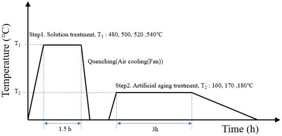 Several studies have investigated different heat treatment parameters, such as the solution temperature, aging temperature, and cooling speed. The T6 heat treatment process is commonly used for die-casting Al alloys and is described below [16,17,18].