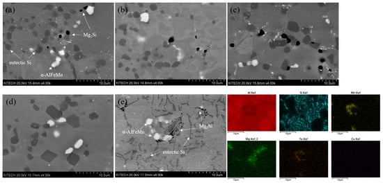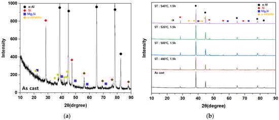 Figure 3 shows the dendritic structures of the die-cast and solution heat-treated Al-11Si-0.5Mg alloys. The presence of α-Al cells are noted in Figure 3a. The coarse eutectic mixtures and intermetallic compounds were located in the inter-dendritic region. Most of the solute elements accumulated at the solid/liquid interface and precipitated during solidification. The die-cast coarse eutectic mixtures and intermetallic compounds were broken into spheroidized morphologies after the solid solution heat treatment, as shown in Figure 3b–e. The XRD analysis indicated that these eutectic mixtures and intermetallic compounds in the inter-dendritic region were composed of eutectic Si, Mg2Si, and α-AlFeMn intermetallic compounds (Figure 4).