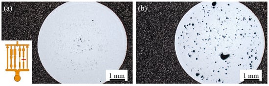 Figure 6 shows the growth of casting defects in the solution-treated and as-cast Al–Mg–Si alloys. The casting defect in the die-cast alloy occurs due to the presence of entrapped gases, which is attributed to the turbulent fluid during the filling of the sleeve [32]. These casting defects increased during heat treatment and negatively impact the mechanical properties [9,18]. Hu et al. [33] reported that the relationship between the pressure, temperature, and volume of gas porosity could be described according to Equation (1):