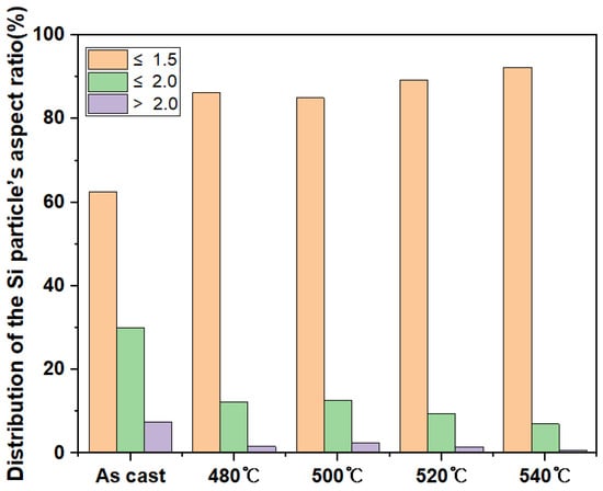 Figure 7 and Table 4 show the variation in the aspect ratios of the Si particles with the solution temperature. A rise in the solution temperature at a constant heat treatment duration increased the fraction of the adjacent aspect ratio value at 1.0. This implies that the needle-type eutectic Si particle transformed into spherical particles.