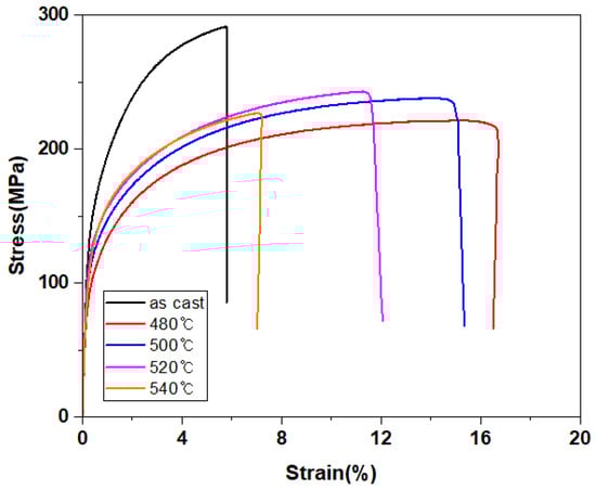 The stress–strain curves of the as-cast and solution heat-treated Al–Mg–Si alloys are shown in Figure 8 and the calculated values are listed in Table 5. The yield strength (YS), ultimate tensile strength (UTS), and elongation (EL) of the as-cast Al–Si–Mg alloy were 155.32 MPa, 290.99 MPa, and 5.17%, respectively. The YS and UTS of the solution-treated Al–Si–Mg alloys decreased, while their EL increased significantly. A rise in the solution heat treatment temperature from 480 to 520 °C increased the YS and UTS by more than 23 and 21 MPa, respectively. The EL of the solution-treated alloys were slightly reduced. The heat treatment at 540 °C for 90 min decreased the UTS and EL values by 10 and 20 MPa, respectively, and increased the YS by 9.1%. These trends were attributed to the variation in the DAS, the precipitate behaviour of the Si particles, and the casting defects. The mechanical properties of the cast Al alloys depend heavily on the variation in the DAS, which is responsible for the differences between the mechanical properties of the cast and solution-treated Al–Mg–Si alloys [34]. Furthermore, the refined Si particles formed by die casting can improve the YP and UTS [9,18,20,30].