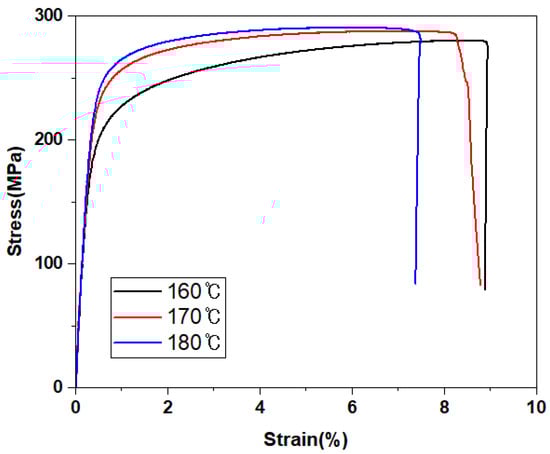 Stress–strain curves of the alloys after the solid solution heat treatment at 520 °C for 90 min, followed by aging heat treatment for 180 min at a—160 °C, b—170 °C, and c—180 °C.