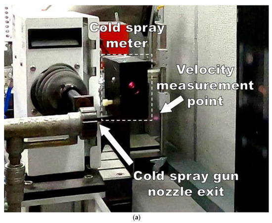 The sprayed powder velocity and diameter were measured using a cold spray meter (CSM EVOLUTION, Tecnar Automation Ltd., Quebec, Canada) with the capability of measuring particle diameters and velocities in the range of 10–300 µm and 10–1500 m/s. The measurement principle of the cold spray meter is the analysis of the electrical signal produced by the laser scattered by the particles during flight. In the measurement process, the laser is illuminated on the cold spray plume to produce a scattered laser reflected from the particles [13]. A photomask with two vertical slits is placed in front of the detector to detect the scattered laser for the particle diameter and velocity analyses. A twin peak electrical signal is generated for analyses in the control module. In the control module, the particle velocity is determined from the equation below:
