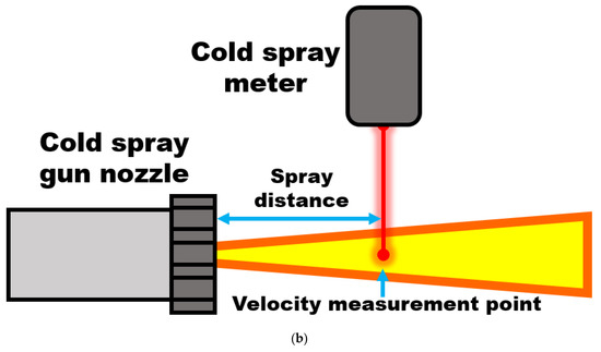 Position of the cold spray gun with respect to the cold spray meter during cold spray operation. The gun is placed perpendicularly to the cold spray meter measurement point and moved to the desired spray distance to perform velocity measurement. The spray distance is measured from the cold spray gun nozzle exit to the velocity measurement point as shown in (a) actual experimental setup and (b) illustration.