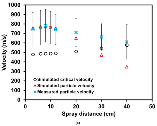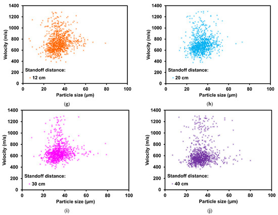 The spray distance was measured from the cold spray gun nozzle exit to the measurement point with no substrate present, as shown in Figure 1a. The cold spray gun was positioned perpendicularly to the laser illumination axis for accurate measurement of the particle velocity, as illustrated in Figure 1b. Spray distances of 3, 6, 8, 10, 12, 20, 30, and 40 cm were chosen for velocity measurement, and the measurement results are shown in Figure 2. The average velocities in Figure 2a were calculated from the individual particle velocity measurements at their corresponding spray distances, as shown in Figure 2b–j. Simulated particle and critical velocity were also included in Figure 2a to observe and compare the trends.