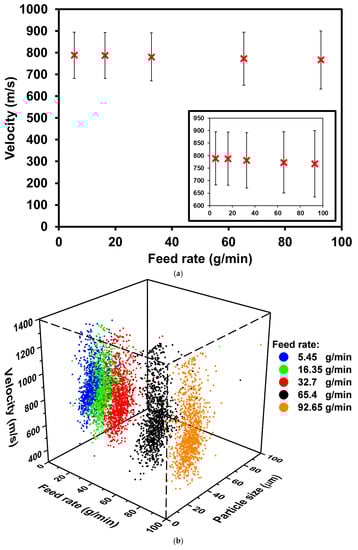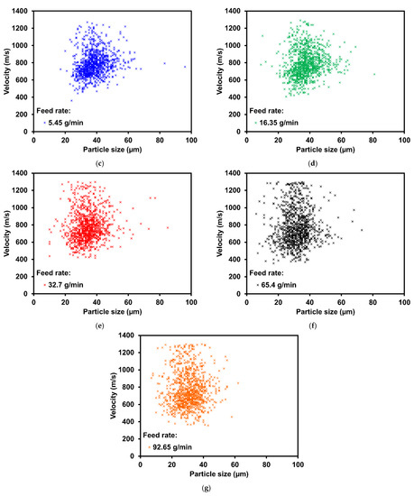 Powder feed rate supplied to the cold spray gun is controlled by adjusting the disk rotating speed in the powder feeder. Powder feed rates of 5.45–92.65 g/min were used for the Inconel 625 powders. The upper limit of the powder feed rate corresponds to the maximum disk rotational speed. The spray distance for this study is the optimum spray distance of 8 cm, as determined from the previous section. The velocity variation with different feed rates is not significant in comparison to the spray distance study, as shown in Figure 3a. Furthermore, the distribution of the individual particle velocity corresponding to the particle size is similar for every feed rate, as shown in Figure 3b–g.