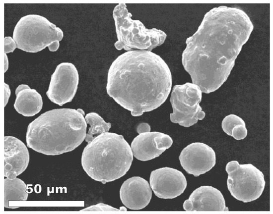 Velocity distribution of the particles was found to be similar at larger spray distances, even with a decrease in velocity. As presented in Figure 2j, considerable amounts of powders are still in the upper range of the velocity distribution at 40 cm. For example, about 12.6% of particles are above 1000 m/s at the optimum spray distance of 8 cm in Figure 2e, and at 40 cm, the amount is quite similar, with 7.1% of particles above 1000 m/s in Figure 2j. This may be due to the irregular Inconel 625 powder morphology, as shown in the SEM image (Figure 4). An irregularly shaped particle has a larger drag force on it and is able to achieve a higher velocity over large distances [24].