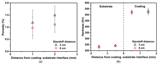(a) Porosity in the coatings and (b) hardness results of Inconel 625 coating at 3 and 8 cm standoff distances.