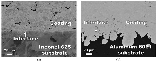 By using the same powder, cold spray system, and parameters within the range discussed in this paper (standoff distance of 3 cm, powder feed rate of 32.7 g/min), Inconel 625 coatings can be successfully deposited on different substrate materials, including Inconel 625 and Aluminum 6061. The deposited coatings on both substrates are shown in Figure 8, which was taken with the SEM operated in the backscattered electron (BSE) mode. In Figure 8a, the deformation of the Inconel substrate at the interface is limited, but the interface was found to be intimate, indicating a good bond between the coating and substrate, while for the Aluminum 6061 substrate in Figure 8b, the substrate was found to be largely deformed by the particles impacted at high velocity. Inconel 625 particles penetrated deep into the substrate due to the lower substrate hardness, leading to mechanical interlocking, which could enhance the bonding between the coating and the substrate. The particle velocity at the same standoff distance is the same for different substrates since the substrates do not affect the flight of the particle.