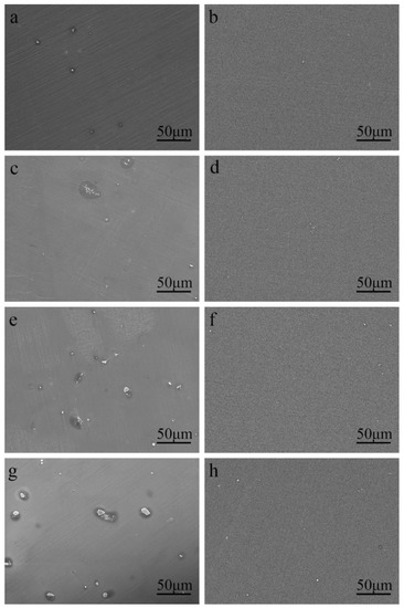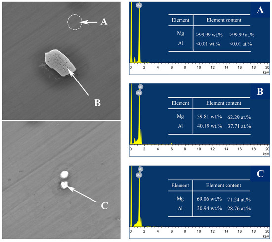 The SEM micrographs of the as-cast Mg–Al alloy and the solid solution alloys are shown in Figure 1. According to Mg–Al binary phase diagram, aluminum can form the finite solid solution with Mg, while the maximum solubility is about 2 wt.% at room temperature [27]. According to Figure 1a,c,e,g, there are a few second phases in the Mg–Al alloy when the concentration of Al is under 2 wt.%. With the increase of Al concentration, the number of second phase particles increases, and the size of second phase particles becomes bigger. To figure out the second phase, detailed views of the as-cast Mg–4Al alloy are shown in Figure 2. According to the energy dispersive spectroscopy (EDS) results, the dark field (A) is the Mg matrix; the bright lumps (B) and particles (C) consist of magnesium and aluminum, which should be β-Mg17Al12. A comparison of the untreated (Figure 1a,c,e,g) with homogenized samples (Figure 1b,d,f,h) indicates that the second phases are nearly dissolved into the matrix within the four different samples at 420 °C after heat-treatment of the solid solution.