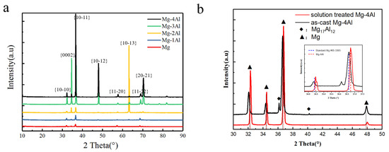 XRD patterns of (a) the solution treated Mg–Al alloys with different Al content, (b) as-cast and solid treated Mg–4Al alloy.