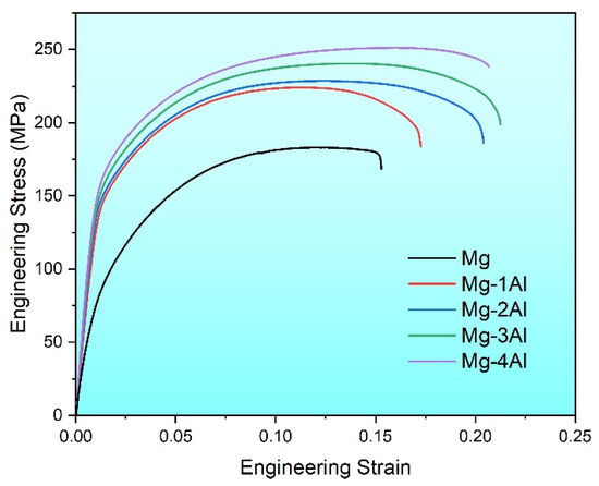 Tensile stress–strain curves of the as-extruded Mg–xAl (x = 0, 1, 2, 3, 4) alloys.